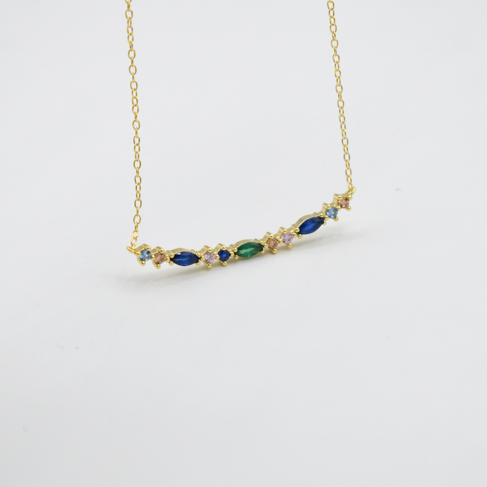 Hermoso collar con circonias en corte marquese y round, fabricado en plata 925 con baño de oro de 18K. combinalo con nuestros aretes y pulseras de piedritas de colores!